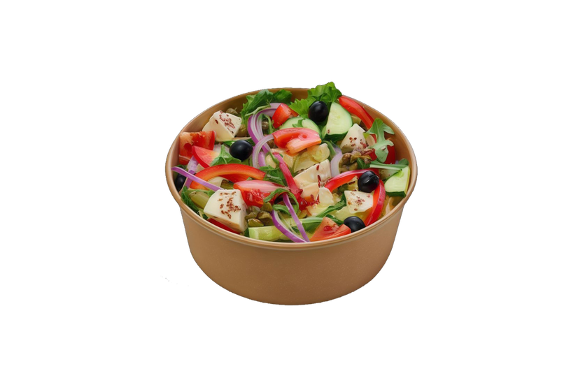 Моцарела, маслини, болгарський перець, салат Айсберг, рукола, помідор, огірок, салат, насіння льону, цибуля маринована, олія з травами.