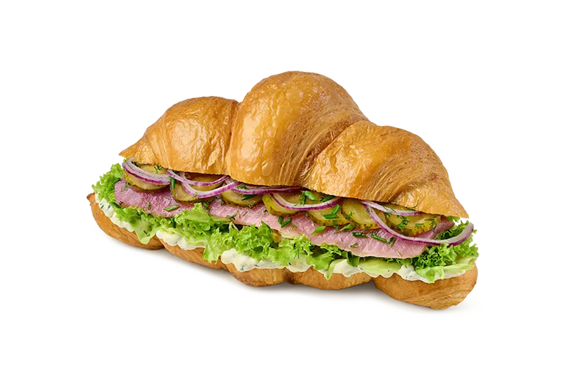 Круасан, оселедець, квашений огірок, соус Айолі-лайм, салат Айсберг, салат Лолло Біонда, маринована цибуля, зелена цибуля, кріп, перець мелений.