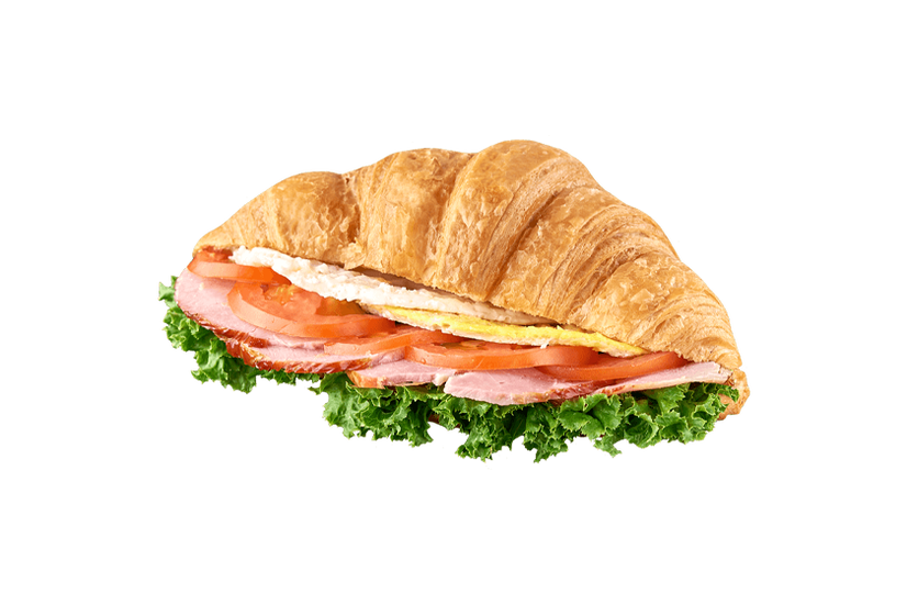 Круасан, сир філадельфія, шинка, яєчня смажена, салат Лолло Біонда, помідор свіжий.