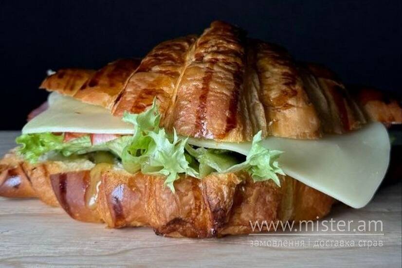 Круасан, гірчично-медовий соус, салат, помідори, шинка, чедер.