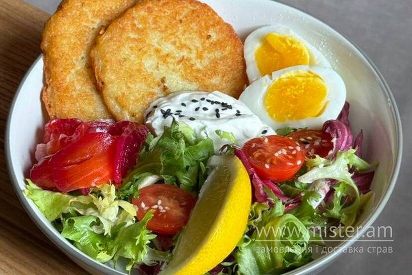 Філе лосося власного посолу, деруни, яйце, чері, мікс салат, оливкова олія, йогурт, кунжут.