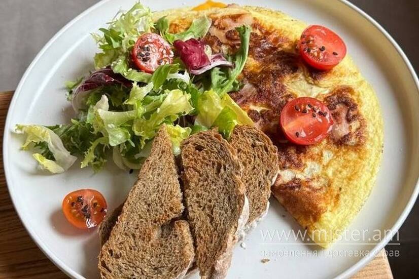 Яйця, молоко, вершкове масло, бекон, чедер, мікс салат, чері, оливкова олія, тост житній.