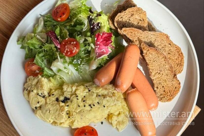 Яйця, молоко, вершкове масло, сосиски міні, мікс салат, оливкова олія, чері, тост житній.
