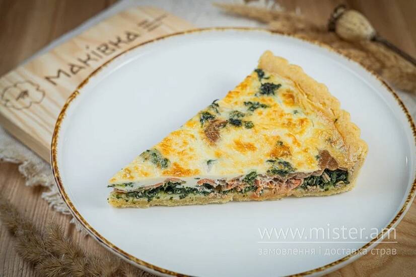 Пісочне тісто, шпинат, лосось, яйця, вершки, сіль, перець.