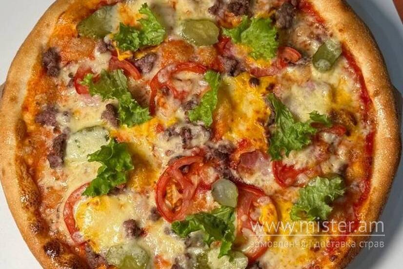 Фарш свино-яловий, бекон, помідори, сир чедер, моцарела, оргірок солоний, соус наполі.