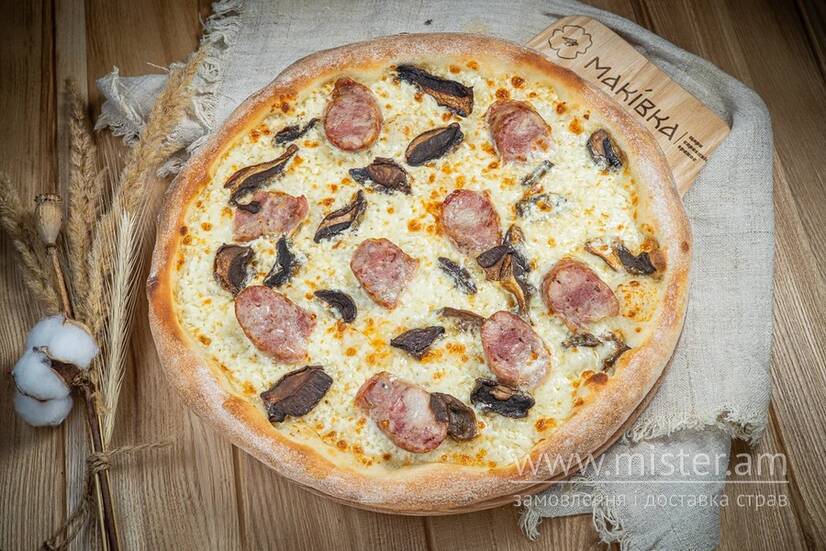 Борошно, дріжджі, сіль, цукор, моцарела, вершки 30%, домашня ковбаса, печериці.