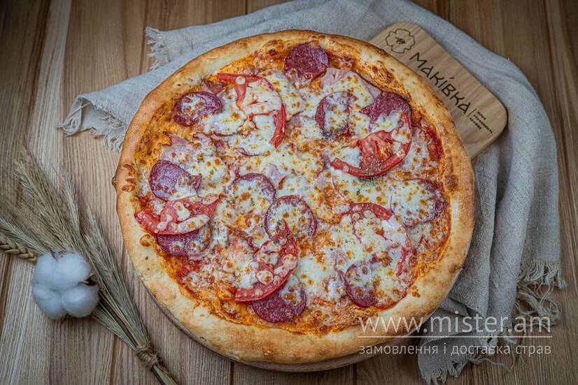 Борошно, дріжджі, сіль, цукор, томатний соус, моцарела, бекон, шинка, салямі, орегано, помідор, олія часникова.