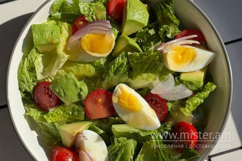 Листя салата, салат ромен, помідори чері, авокадо, яйце, цибуля синя, салатна заправка.