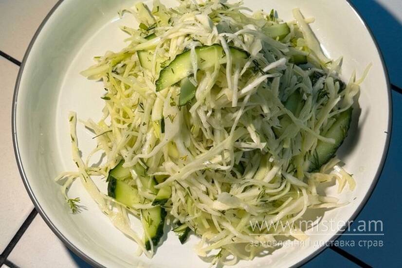 Капуста білокачанна, свіжий огірок, зелень укропа, сіль, цукор, яблучний оцет, олія.