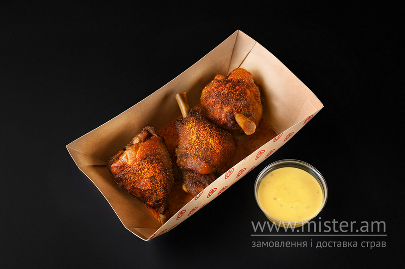 Курячі ніжки «Лоліпоп» в соусі Барбекю, доповнені Медово-гірчичним соусом.