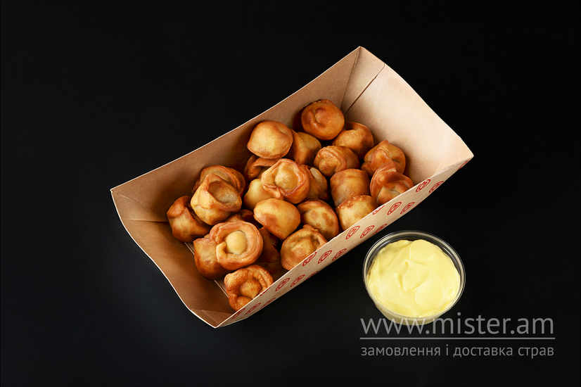 Пельмені зі свинини та яловичини, обсмажені до золотистого кольору та хрумкої скоринки. Подаються з Сирним соусом.