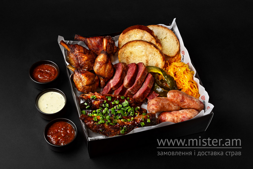 Ковбаски із зернами гірчиці, свинячі ребра BBQ, томлений яловичий бріскет з соусом Барбекю, курячі ніжки «Лолліпоп», капуста карі, огірок гірчичний, булочка Бріош, соуси До шашлику та Часниковий з тахіні.