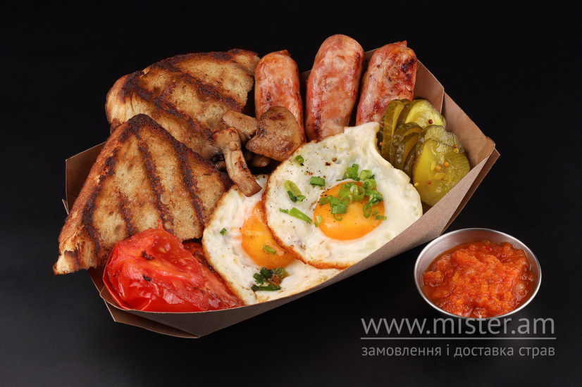 Смажене яйце, ковбаски, печений томат і печериці, гірчичний огірок, аджика, зерновий тост, зелена цибуля.