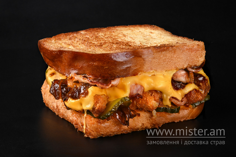 Хрумкі курячі стріпси, сир Чедер, чипса з бекону, гірчичний огірок, цибулевий конфітюр, соус Сирний, соус Спайсі, вершкое масло, хліб бріош.