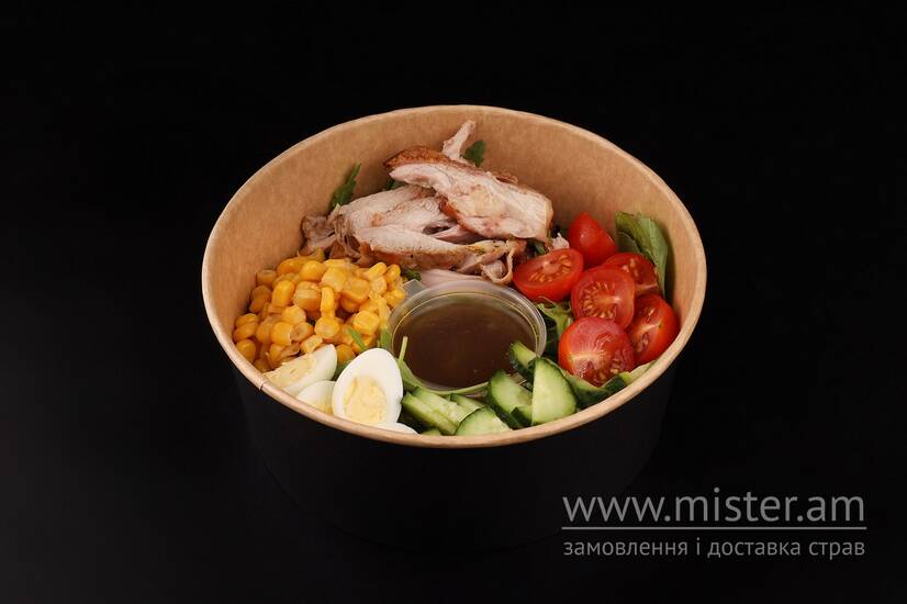 Курка, соус Бальзамік, солодка кукурудза, томати чері, огірок, перепелине яйце, шпинат, рукола.