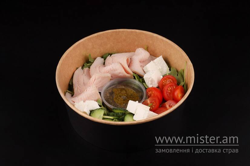 Індичка карі, соус Песто, томати чері, огірок, рукола, сир фета.