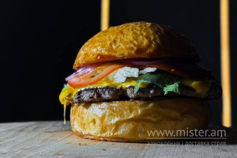 Булочка, котлета з яловичини, сир Чедер, соус Айолі, листя салату айсберг, помідори, цибуля та соус BBQ.