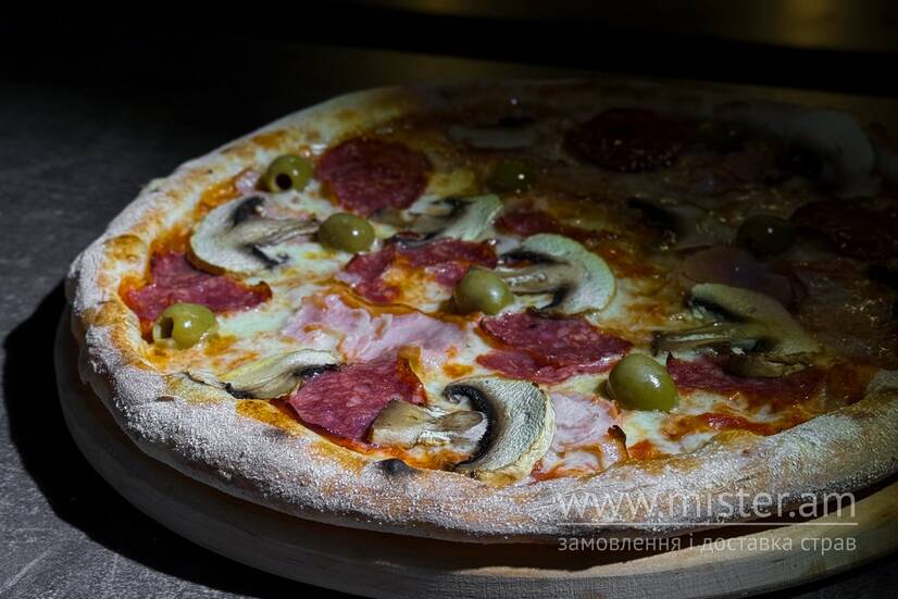 Салямі, шинка, гриби, оливки на соусі з цілих томатів та моцарелою.