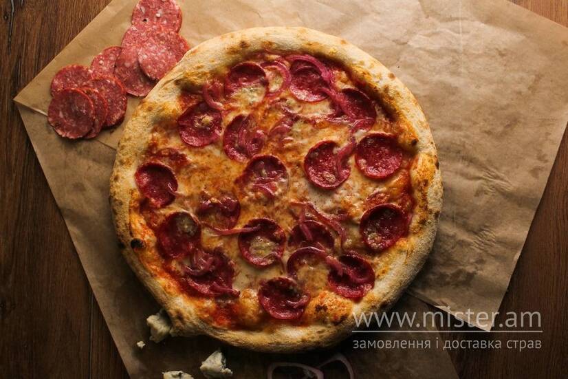 Салямі, дор блю, маринована цибуля на соусі з цілих томатів та моцарелою.