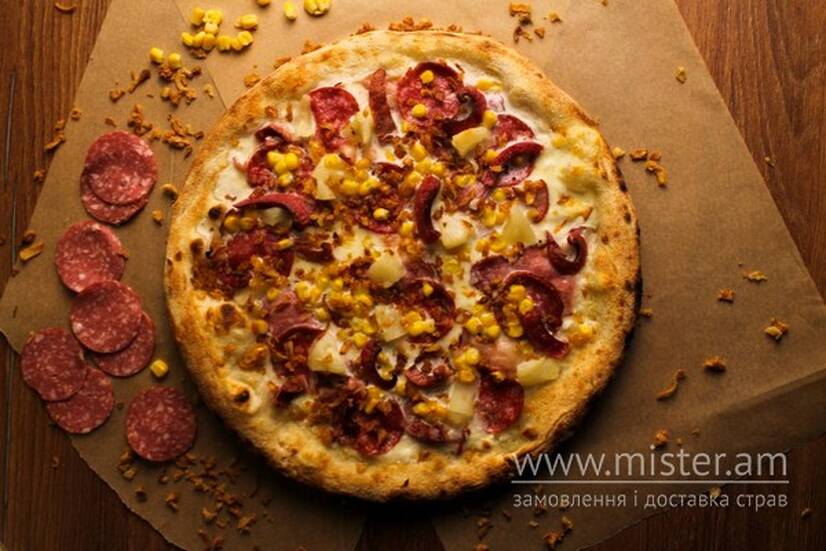 Вершковий соус, сир Моцарела, салямі, бекон, шинка, мисливські ковбаски, ананас, кукурудза, цибулевий кранч.