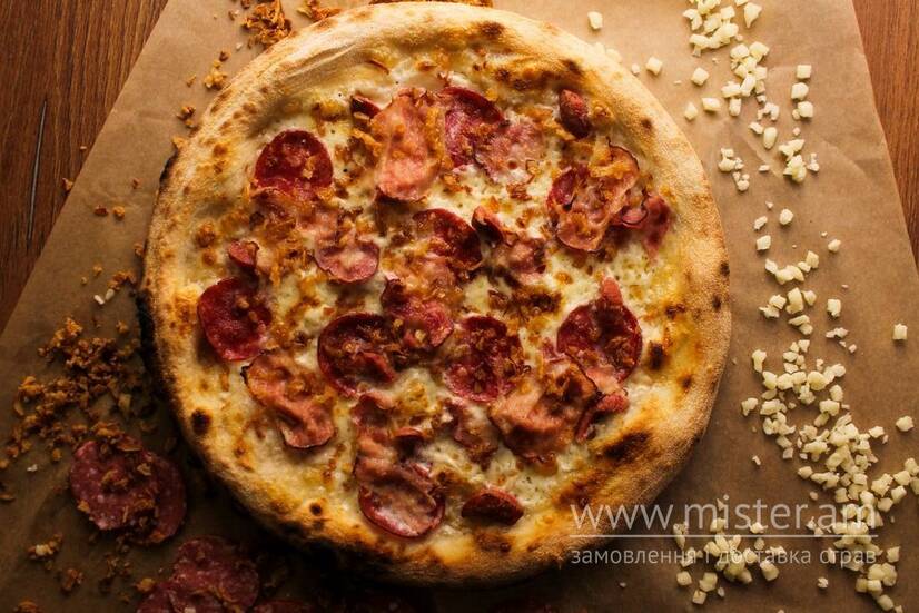 Вершковий соус, сир Моцарела, салямі, шинка, бекон, мисливські ковбаски, цибулевий кранч.