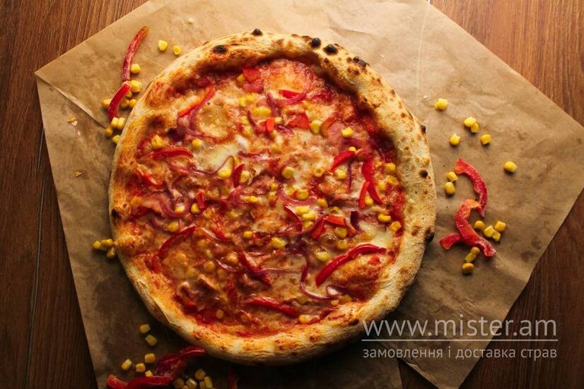 Томатна основа, сир Моцарела, кукурудза, болгарський перець, цибуля маринована, бекон.