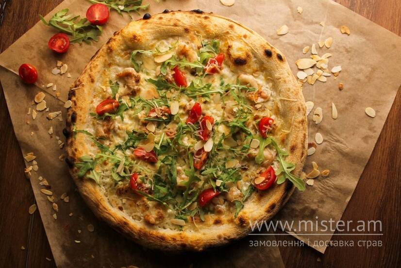 Креветки, рукола, томати чері та мигдаль на вершковому соусі з моцарелою та пармезаном.