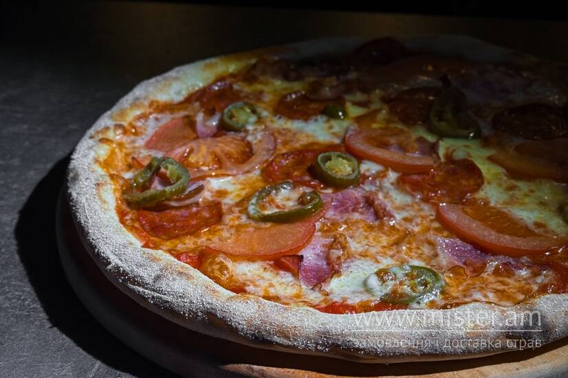Італійська пікантна пепероні з беконом, томатами та перцем халапеньо на соусі з цілих томатів та моцарелою.