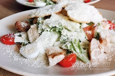 Смажене куряче філе, пармезан, салат, айсберг, бекон, яйця перепелині, томат чері, сухарики, соус Цезар.