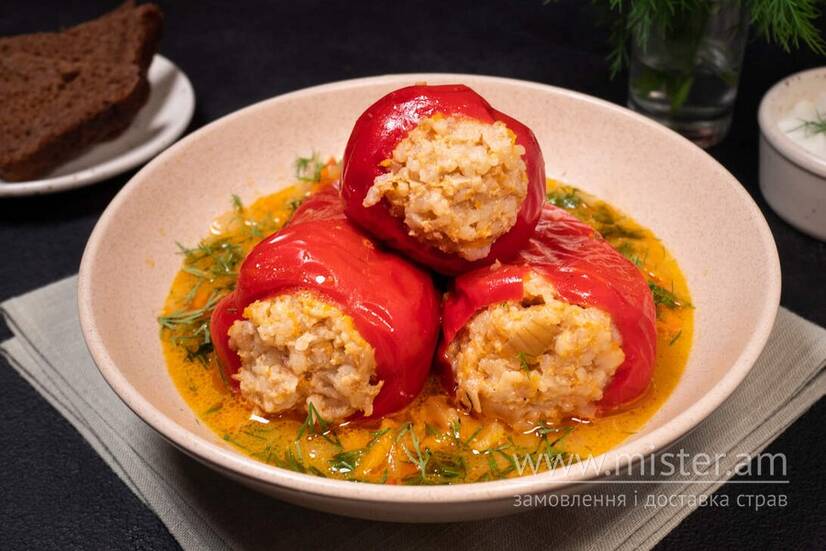 Перець болгарський солодкий (40%), рис відварений (24%) (рис, вода питна, сіль кухонна), свинина знежилована (18%), цибуля ріпчаста смажена (9%) (цибуля, олія соняшникова рафінована, сіль кухонна, перець чорний мелений), морква смажена (9%) (морква, олія соняшникова рафінована, сіль кухонна), сіль кухонна, перець чорний мелений.