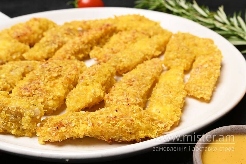 Філе хека (62,00%), кукурудзяні пластівці (15,00%), вода питна (9,89%), борошно пшеничне вищого ґатунку (8,51%), яйця курячі (3,45%), приправа до риби (0,81%), сіль кухонна (0,23%), перець чорний мелений (0,07%).