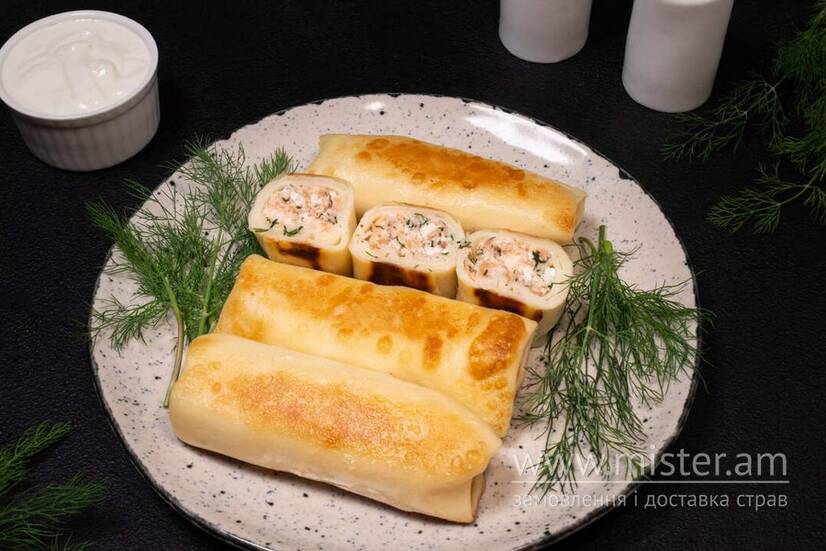 Молоко коров`яче (32%), філе лосося мариноване (24%), борошно пшеничне вищого ґатунку (13%), сир кисломолочний (13%), яйця курячі, масло вершкове, зелень свіжа, вода питна, цукор білий кристалічний, сіль кухонна.