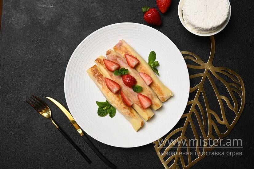 Молоко коров`яче (30%), сир кисломолочний (23%), полуниця (18%), борошно пшеничне вищого ґатунку (12%), яйця курячі, цукор білий кристалічний, вода питна, масло вершкове, цукор ванільний, сіль кухонна.