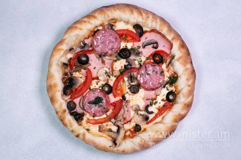 Борошно пшеничне вищого ґатунку (28%), вода питна (15%), сир моцарела (15%), помідори пульпа (10%), крем-сир Філадельфія (7%), помідори свіжі (6%), шинка копчена (6%), гриби печериці (5%), ковбаса салямі (4%), маслини, олія соняшникова рафінована, сіль кухонна, дріжджі пресовані хлібопекарські, цукор білий кристалічний, зелень свіжа, приправа орегано.