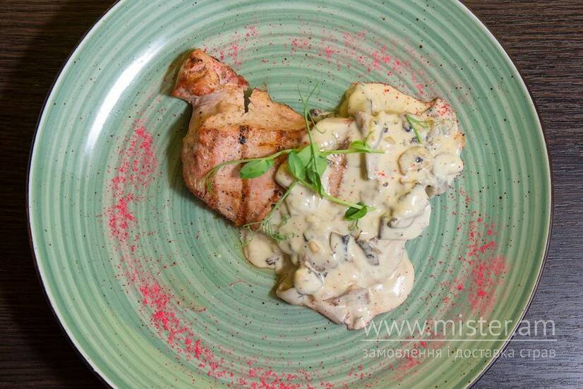 Телятина, перчик чілі, цибуля синя, перець болгарський, часник, соус Азія. Подається зі сметаною та соусом Сальса.