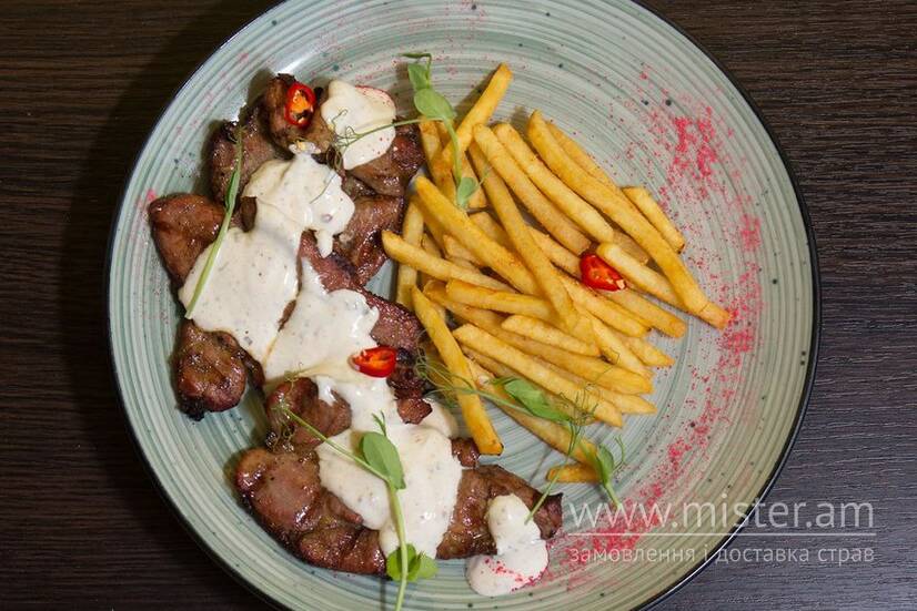 Свинина під пряним йогуртом, з картоплею фрі