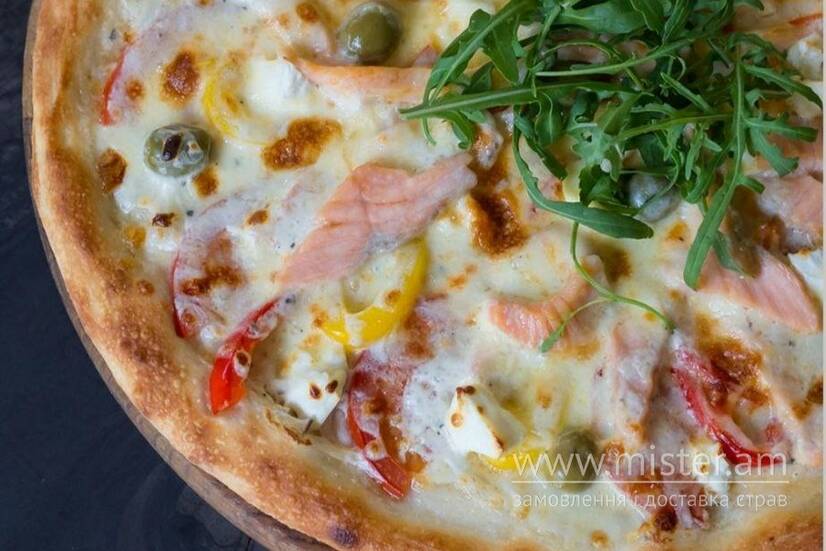 Лосось, сир Фета, сир Моцарела, томати, оливки, болгарський перець, білий соус