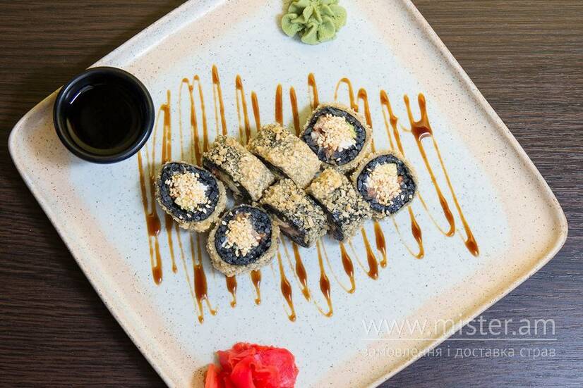 З креветкою темпура, авокадо, вугрем, лососем, тобіко та вершковим сиром.
