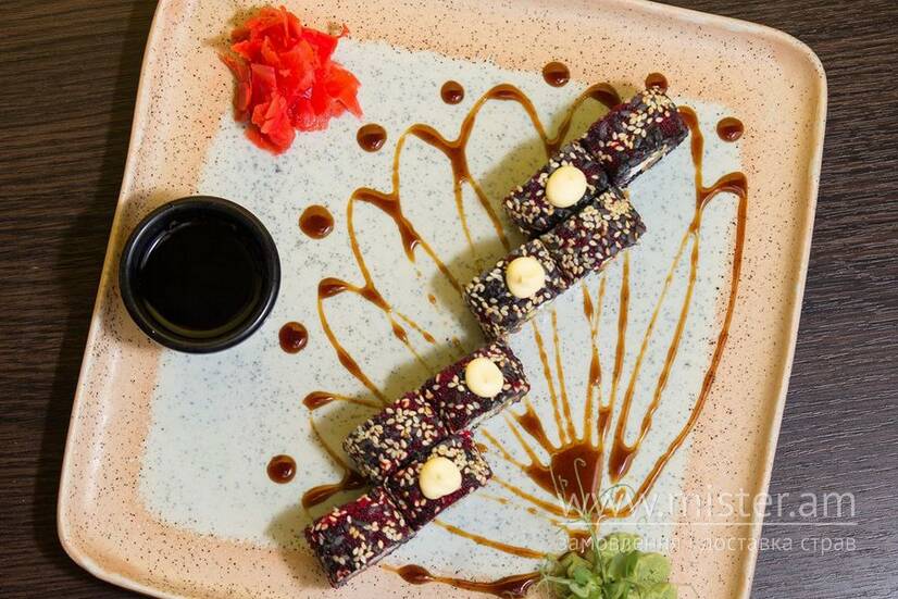 З чорним рисом, лососем, авокадо та креветкою, огірком, вершковим сиром та тобіко.