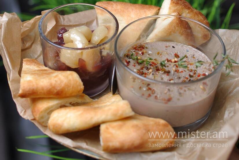 Курячий паштет, цибулевий мармелад, піта.