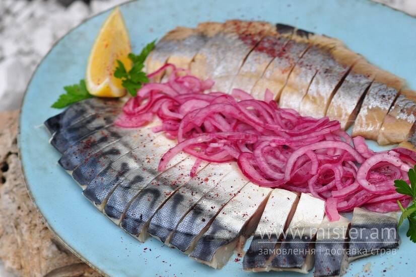 Оселедець с/с, скумбрія с/с, червона цибуля.