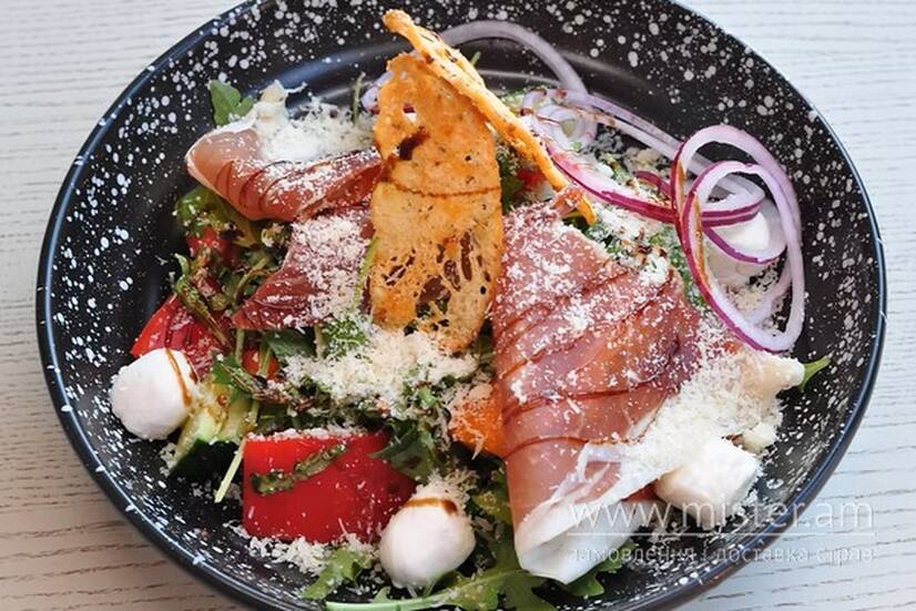 Овочі, моцарела бебі, пармезан, прошутто, італійський соус.
