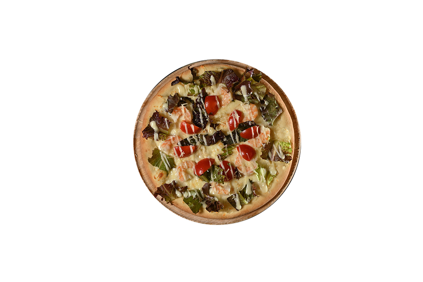 Вершковий соус, моцарела, листя салату, креветка, помідори чері, соус цезар, пармезан.