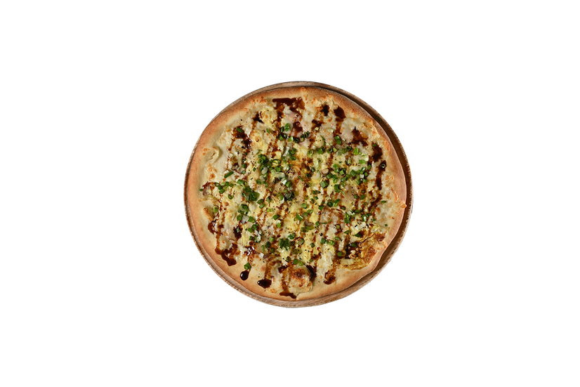 Соус пелаті, моцарела, бекон, яйце, зелена цибуля, пармезан.