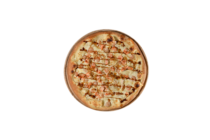 Вершковий соус, моцарела, філе лосося, креветка, пармезан.