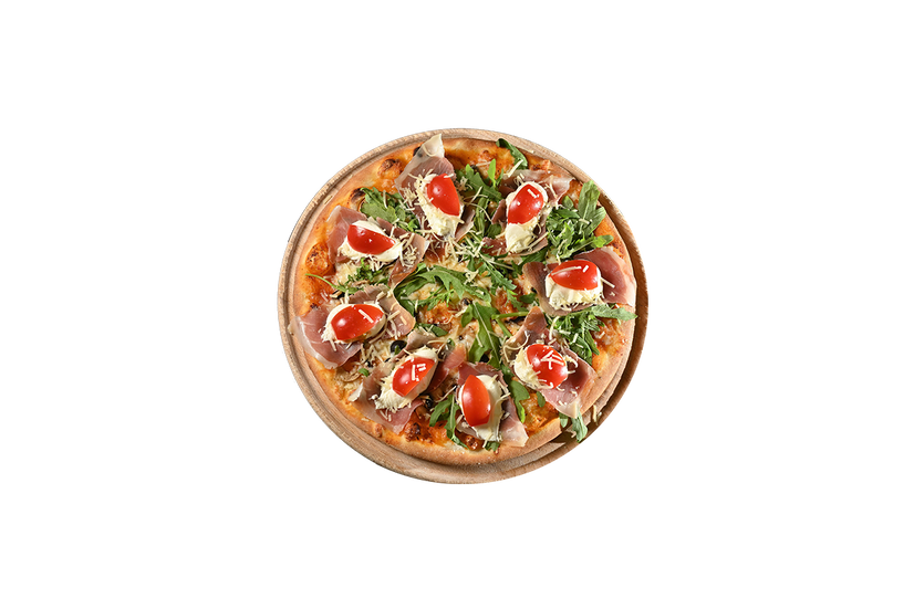 Соус пелаті, сир моцарела, прошуто, печериці, маслини, пармезан, рукола/зелена цибуля.
