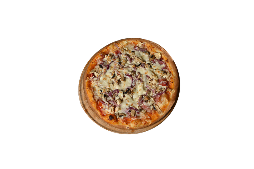 Соус пелаті, моцарела, бекон, шинка, мисливські ковбаски, печериці, цибуля маринована, куряче філе.
