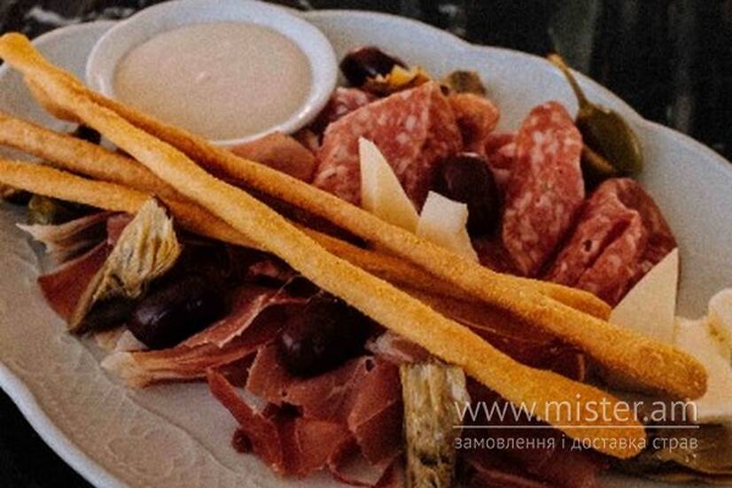 Мікс антипасто на двох - Прошуто Крудо, тунцовий соус Вітелло Тоннато, грисині власної пекарні, сир Пекоріно Романо, артишоки-гриль, салямі Мілано, в`ялені томати.