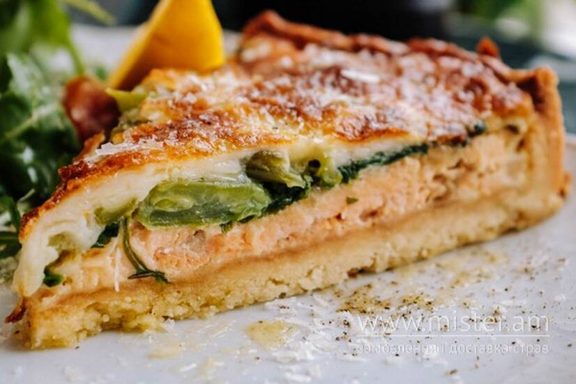 Відкритий пиріг на основі пісочного тіста з сьомгою, шпинатом, стручковою квасолею, тим'яном і сиром Моцарела. Подаємо з сайд-салатом з руколи і томатів Чері і тертим сиром Пармезан 24-місячної витримки.