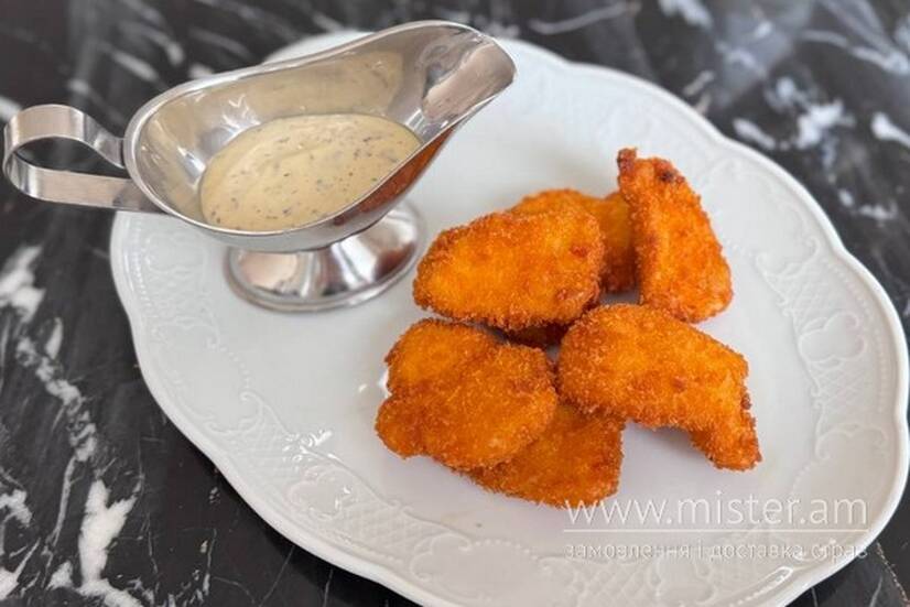 Соковиті шматочки курячого філе в хрусткій золотистій паніровці. Подаються з ніжним соусом на основі майонезу та трюфельної пасти.